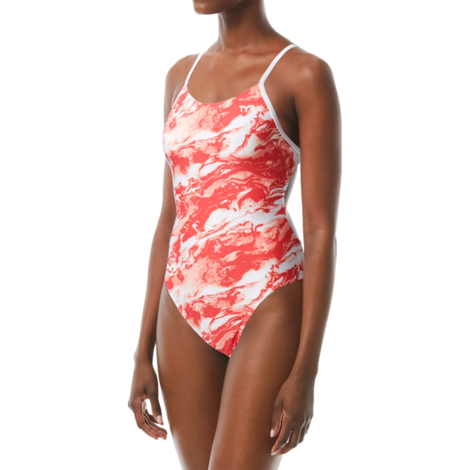 Swim with style and confidence in the TYR Marble Clouds Cutoutfit Swimsuit in Coral. Featuring a soft, watercolor-inspired marble pattern, this suit blends elegant design with performance-driven features. Made with TYR’s durable Durafast Elite® fabric, it offers excellent stretch, chlorine resistance, and over 300 hours of wear. The Cutoutfit silhouette provides a low neckline, thin straps, and a high-cut leg for maximum mobility and a sleek, athletic look.